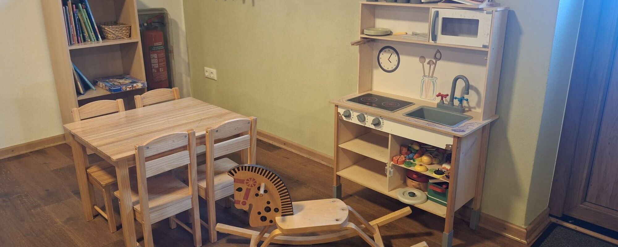 Im Innenbereich wartet eine gemütliche Spielecke, draußen sorgen Sandkasten, Strohhüpfburg und viele Fahrzeuge für Spaß und Bewegung – natürlich sicher abseits der Straße.