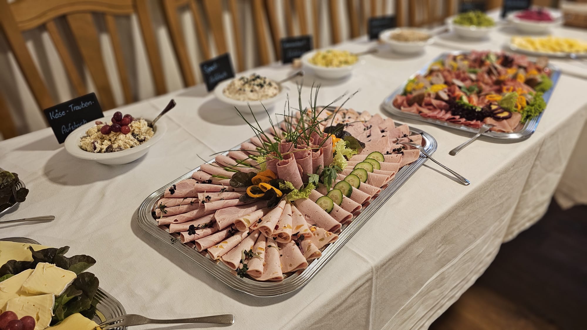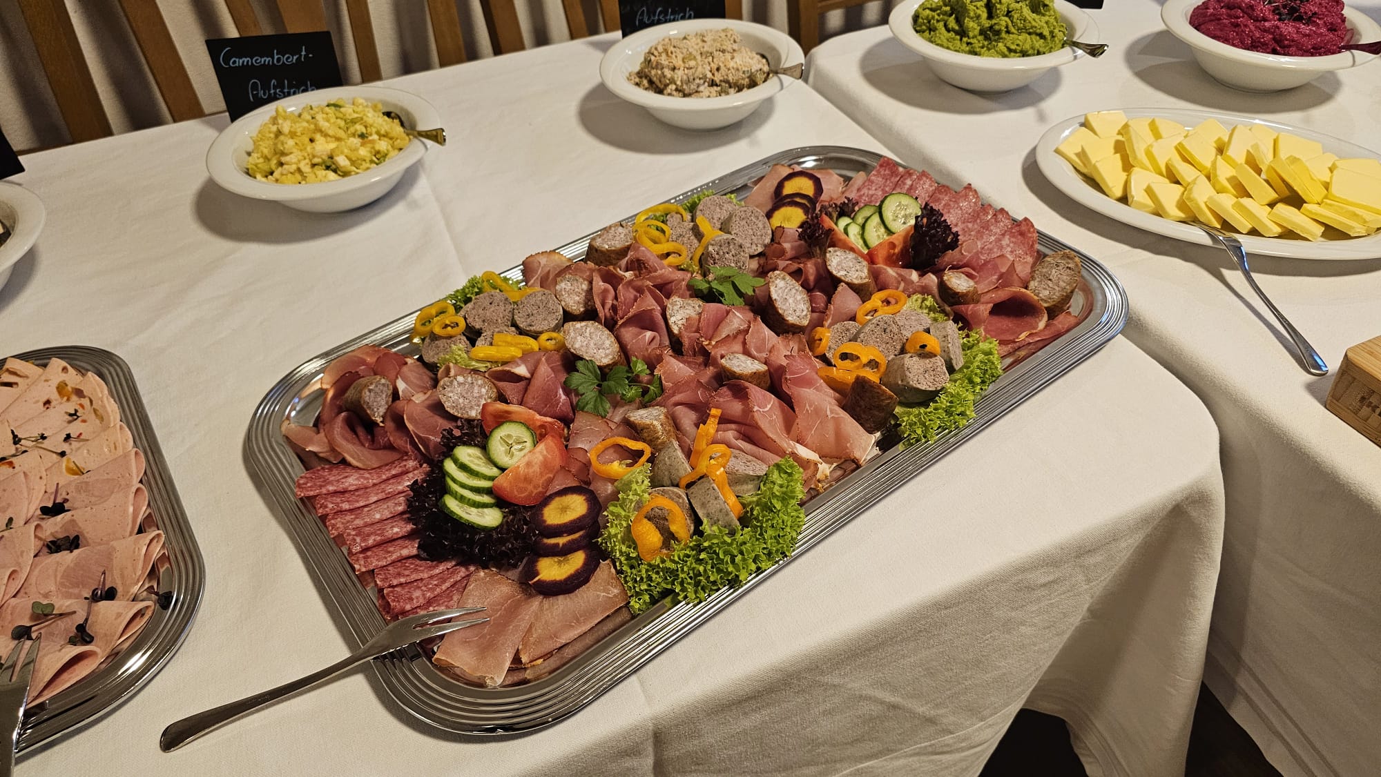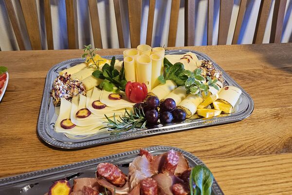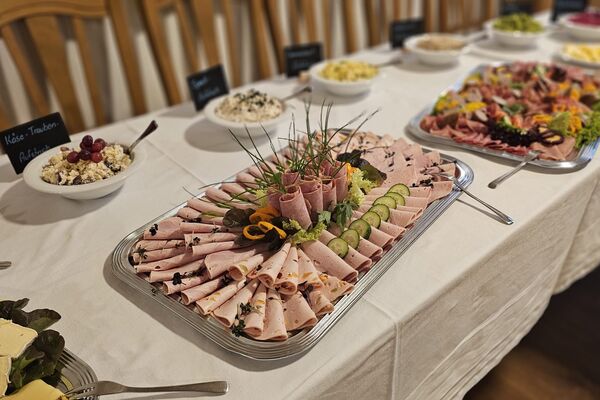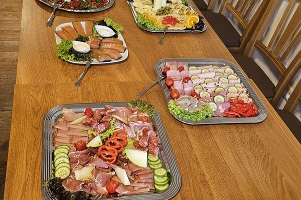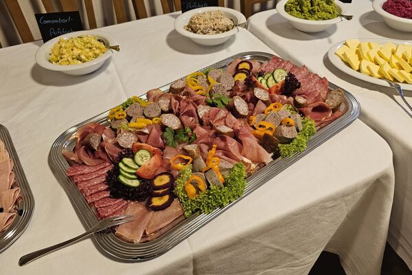 Dazu gibt es Schinken- und Wurstspezialitäten aus eigener Schweinehaltung sowie feine Käsesorten, sorgfältig ausgewählt und mit echter Herkunft.