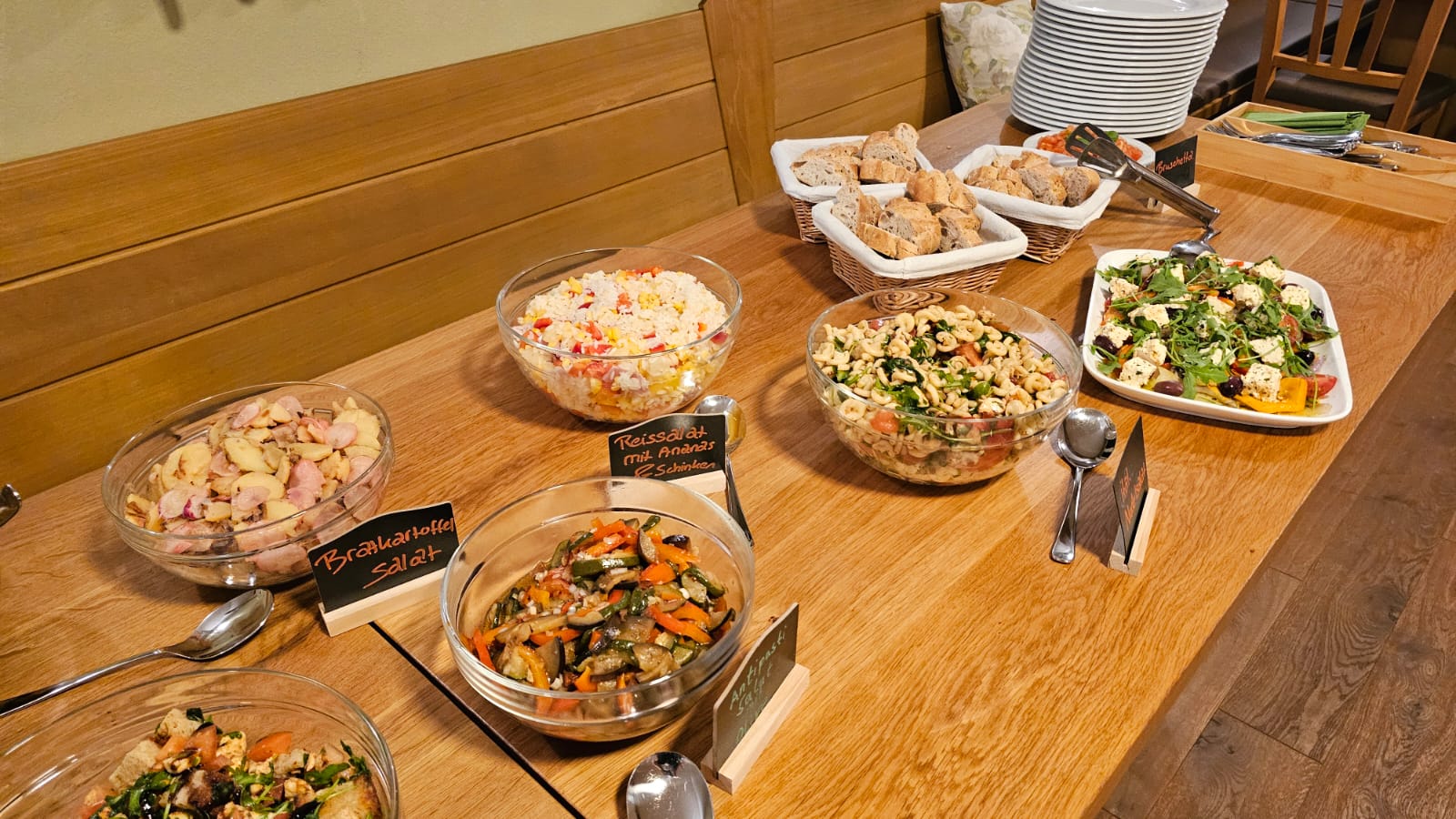 Brot, Baguette und weitere Beilagen stehen bereit und machen das Grillbuffet komplett.