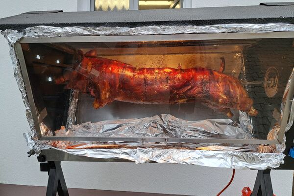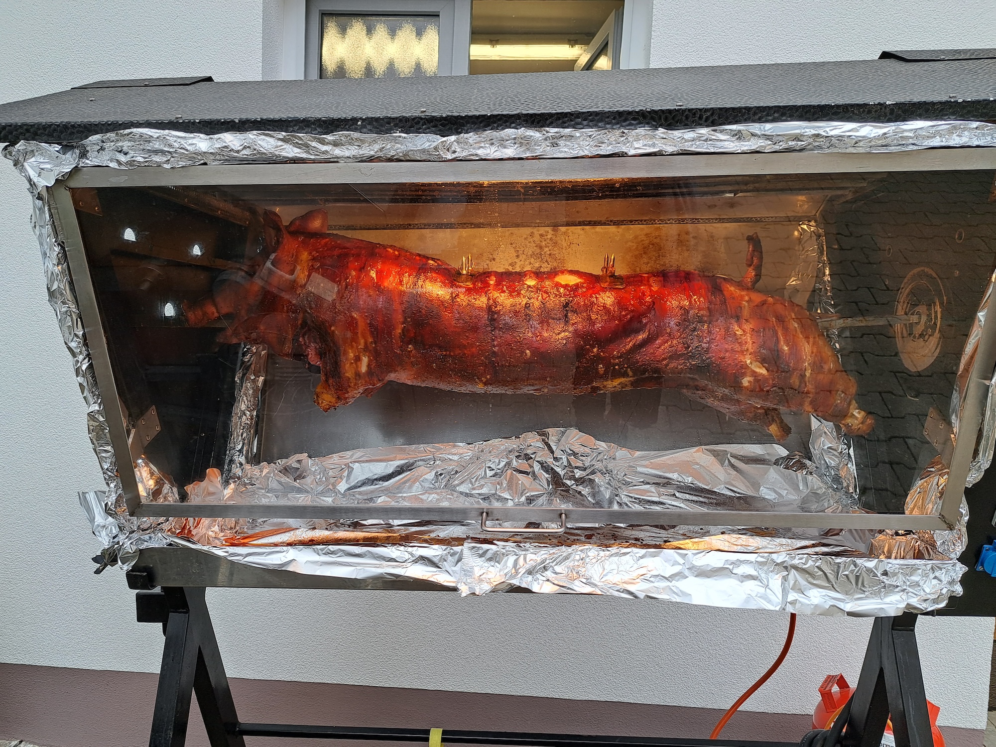 Zur Mittagszeit steht das Herzstück des Tages bereit: Spanferkel vom Grill aus eigener Aufzucht. Langsam zubereitet, saftig und herzhaft – genau so, wie man es sich wünscht und worauf man sich jedes Jahr wieder freut.